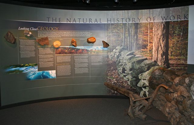 Connecticut State Museum of Natural History. University of Connecticut, 2007-2008. Design assistance, script-writing, and technical consulting for three exhibits: the entry (stone wall) exhibit; Connecticut geology; and climate history exhibits. What had been my teaching collection of special stones was mounted to the wall as part of the exhibit.